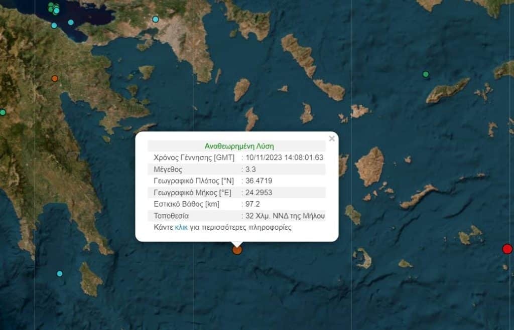 Σύμφωνα με την Αναθεωρημένη Λύση από το Γεωδυναμικό Ινστιτούτο Αθηνών ο σεισμός ήταν μεγέθους 3,3 Ρίχτερ και σημειώθηκε 32 χιλιόμετρα νότια νοτιοδυτικά της Μήλου.