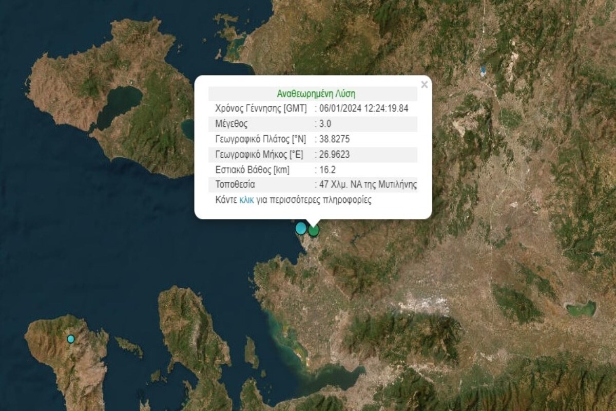 Νωρίτερα αισθητός ήταν ο σεισμός μεγέθους 3,7 βαθμών της κλίμακας Ρίχτερ που καταγράφηκε, το Σάββατο (06/01), κοντά στη Μυτιλήνη.