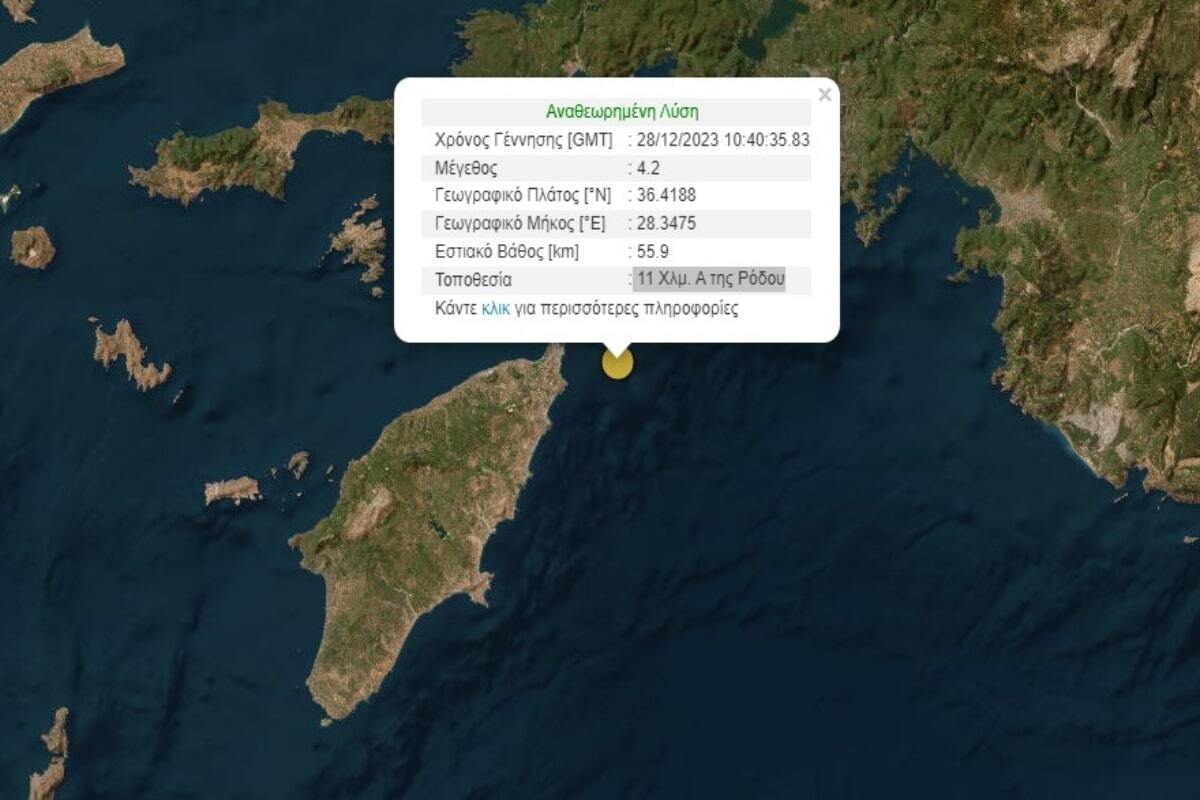 Όπως αναφέρει το Γεωδυναμικό Ινστιτούτο, το επίκεντρο εντοπίζεται 11 χιλιόμετρα ανατολικά της Ρόδου ενώ το εστιακό βάθος στα 55,9 χιλιόμετρα.