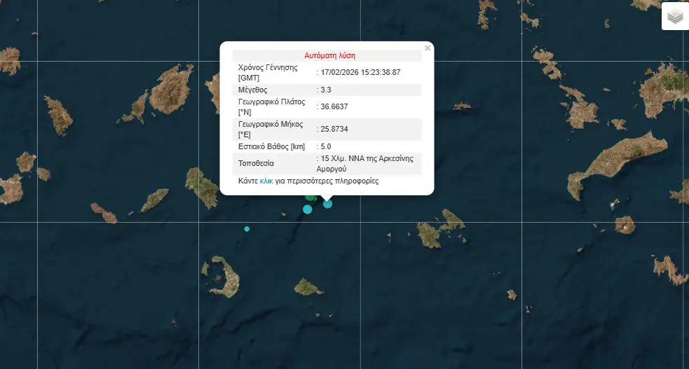 Η σεισμική δόνηση είχε εστιακό βάθος 5 χλμ. και το επίκεντρο τοποθετείται 15 χλμ. ΝΝΑ της Αρκεσίνης, Αμοργού.
