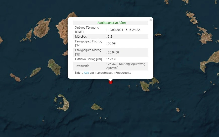 Το επίκεντρο του σεισμού των 3,2 βαθμών της κλίμακας Ρίχτερ εντοπίζεται σε απόσταση 25 χιλιομέτρων νότια – νοτιοανατολικά της Αρκεσίνης Αμοργού. Το εστιακό βάθος της δόνησης βρίσκεται στα 122,9 χιλιόμετρα.