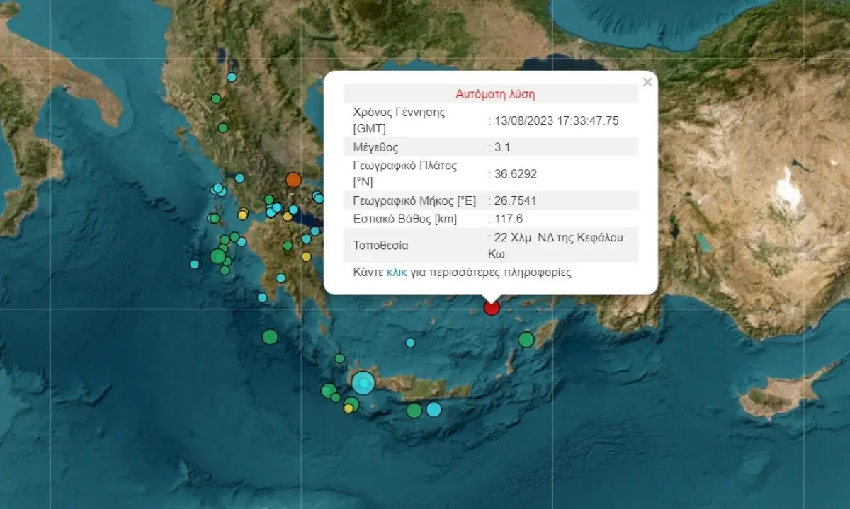 Σύμφωνα με τα πρώτα στοιχεία του Γεωδυναμικού Ινστιτούτου, η σεισμική δόνηση σημειώθηκε 22 χλμ ΝΔ της Κεφάλου στην Κω. Ο σεισμός έγινε σε εστιακό βάθος 117, 6 χιλιομέτρων.