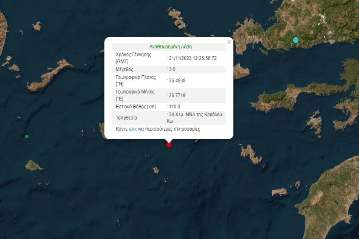 Σύμφωνα με το Γεωδυναμικό Ινστιτούτο, το επίκεντρο της σεισμικής δόνησης εντοπίζεται 34 χιλιόμετρα νοτιοδυτικά της Κεφάλου Κω ενώ το εστιακό βάθος στα 110 χιλιόμετρα.