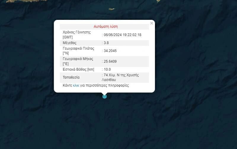 Σύμφωνα με την αυτόματη λύση του Γεωδυναμικού Ινστιούτου του Αστεροσκοπείου Αθηνών ο σεισμός είχε ένταση 3,8 βαθμούς της κλίμακας Ρίχτερ. Το επίκεντρο του σεισμού εντοπίστηκε 74χλμ νότια της Χρυσής Λασιθίου ενώ το εστιακό βάθος εκτιμάται στα 10χλμ.