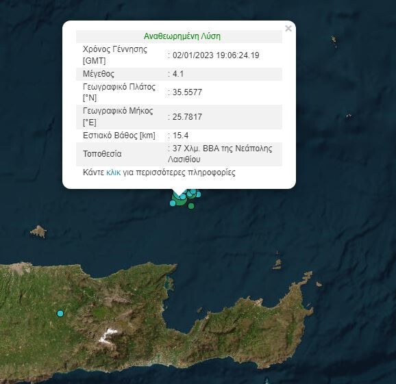 Το επίκεντρο του σεισμού, ο οποίος σημειώθηκε στις 21.06 το βράδυ, σήμερα Δευτέρα, εντοπίζεται 37 χιλιόμετρα βόρεια – βορειοανατολικά της Νεάπολης Λασιθίου. Το εστιακό βάθος εκτιμάται στα 15.4 χιλιόμετρα.