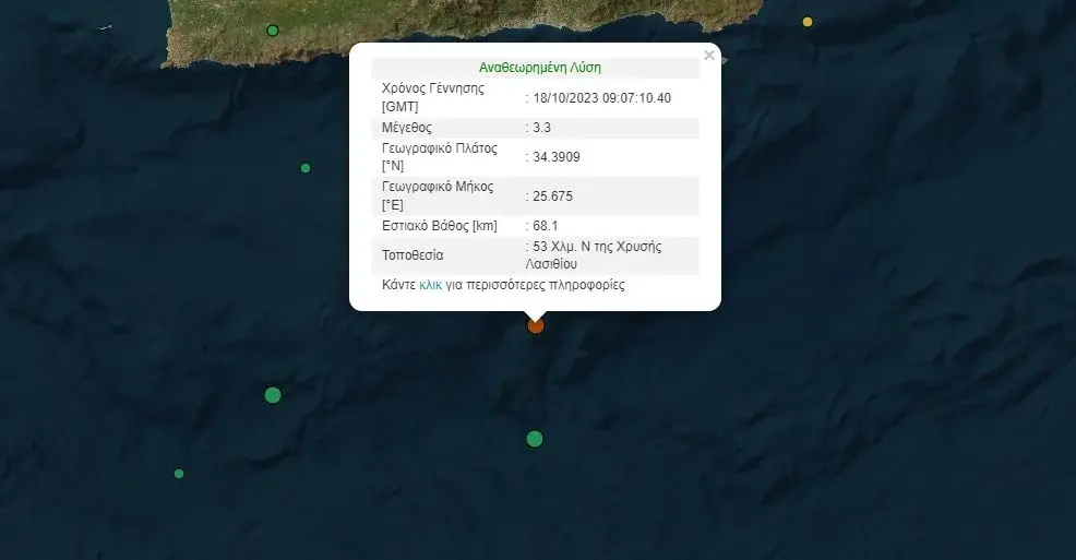Σύμφωνα με την αυτόματη λύση του Γεωδυναμικού Ινστιτούτου Αθηνών, το επίκεντρο του σεισμού εντοπίστηκε 53 χιλιόμετρα νότια της Χρυσής στο Λασίθι. Το εστιακό βάθος του σεισμού υπολογίζεται στα 68 χιλιόμετρα.