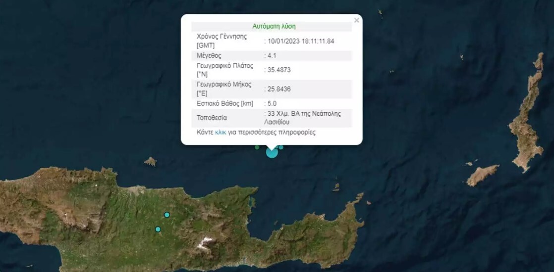 Ο νέος σεισμός των 4,1 βαθμών, σύμφωνα με την αυτόματη μέτρηση του Γεωδυναμικού Ινστιτούτου, ο οποίος τρόμαξε την Κρήτη σημειώθηκε στις 8:11 το βράδυ της Τρίτης (10/1/2023). Το επίκεντρο της σεισμικής δόνησης εντοπίζεται στα 33 χιλιόμετρα βορειοανατολικά της Νεάπολης Λασιθίου.