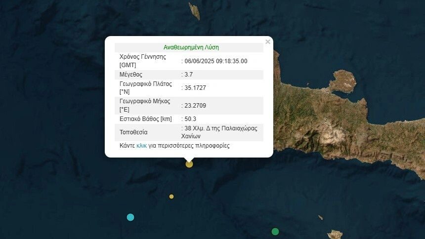 Σύμφωνα με την αυτόματη λύση του Γεωδυναμικού Ινστιτούτου του Εθνικού Αστεροσκοπείου Αθηνών, ο σεισμός έχει επίκεντρο 34 χιλιόμετρα δυτικά της Παλαιοχώρας Χανίων, ενώ το εστιακό βάθος υπολογίζεται σε 23,7 χιλιόμετρα.