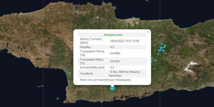 O σεισμός ήταν 4,5 βαθμών της κλίμακας Ρίχτερ, όπως καταγράφει το Γεωδυναμικό Ινστιτούτο του Εθνικού Αστεροσκοπείου Αθηνών ενώ το εστιακό του βάθος είναι 5 χιλιόμετρα εστιακό βάθος και το επίκεντρό του βρίσκεται στα 8 χιλιόμετρα ανατολικά βορειοανατολικά της Μιαμούς Ηρακλείου.