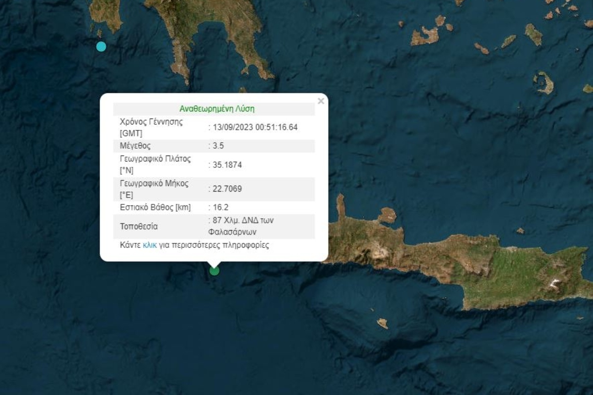 Ο σεισμός ήταν 3,5 βαθμών της κλίμακας Ρίχτερ και σημειώθηκε τα ξημερώματα της Τετάρτης (13/9/2023), στο θαλάσσιο χώρο δυτικά της Κρήτης.