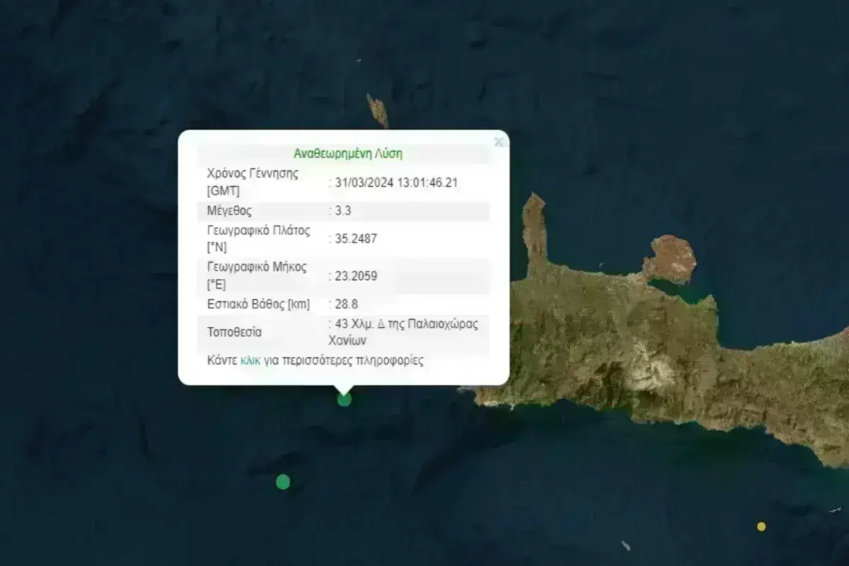 Σύμφωνα με την αναθεωρημένη λύση του Γεωδυναμικoύ Ινστιτούτου, το επίκεντρο του σεισμού εντοπίζεται 43 χιλιόμετρα δυτικά της Παλαιοχώρας Χανίων, ενώ το εστιακό βάθος υπολογίζεται στα 28,8 χιλιόμετρα.