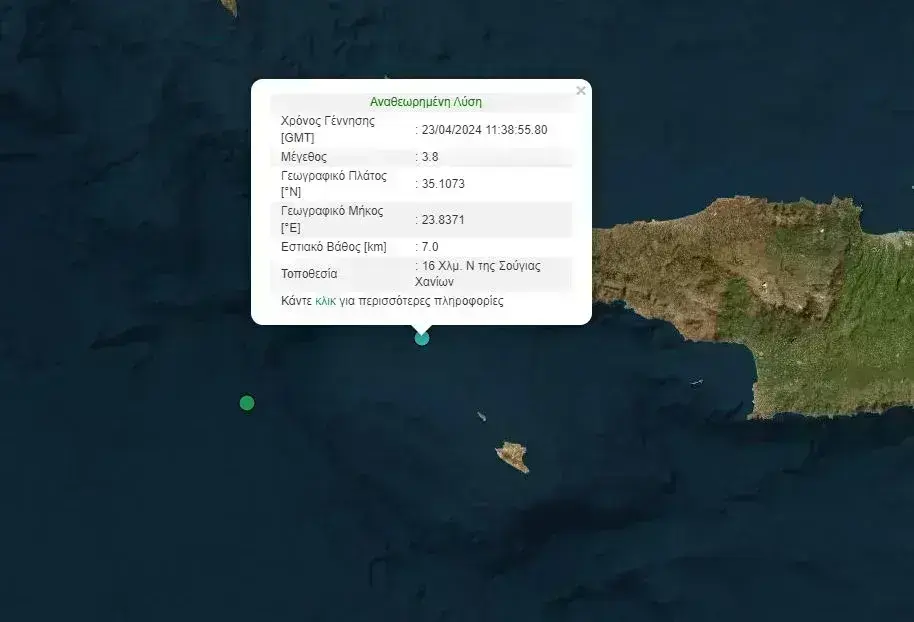 Σύμφωνα με τις πρώτες πληροφορίες από το Γεωδυναμικό Ινστιτούτο, ο σεισμός ήταν μεγέθους 3,8 βαθμών της κλίμακας Ρίχτερ, το επίκεντρο εντοπίζεται 16 χιλιόμετρα νότια της Σούγιας Χανιών ενώ το εστιακό βάθος στα 7 χιλιόμετρα.