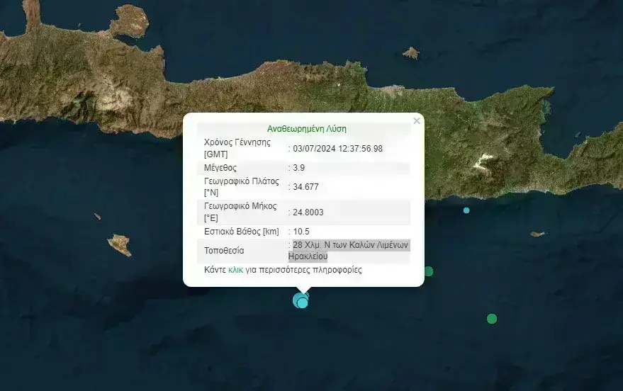 Σύμφωνα με το Γεωδυναμικό Ινστιτούτο, το επίκεντρο εντοπίζεται 28 Χιλιόμετρα νότια των Καλών Λιμένων Ηρακλείου ενώ το εστιακό βάθος στα 10, 5 χιλιόμετρα.