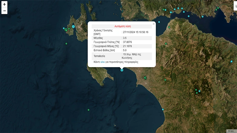 Σεισμική δόνηση 3,5 βαθμών της κλίμακας Ρίχτερ, έλαβε χώρα πριν από λίγο, 15 χιλιόμετρα Νοτιοδυτικά της Κυλλήνης. Το εστιακό βάθος του σεισμού ήταν στα 5 χιλιόμετρα σε θαλάσσια περιοχή.