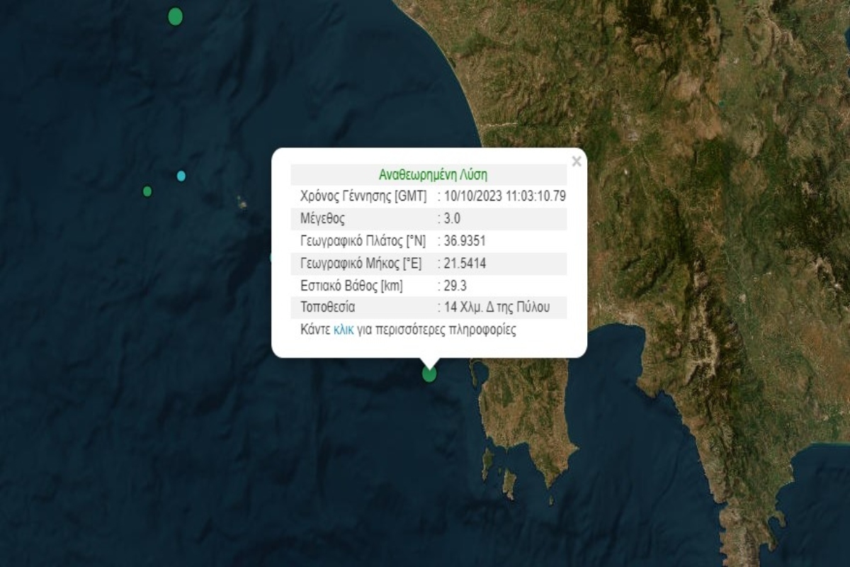 Συγκεκριμένα τα Ρίχτερ χτύπησαν 14 χιλιόμετρα δυτικά της Πύλου ενώ το εστιακό βάθος εντοπίζεται στα 29,3 χιλιόμετρα.