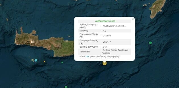 Το επίκεντρο της δόνησης εντοπίζεται στο θαλάσσιο χώρο 34 χλμ. ΝΑ του Γουδουρά Λασιθίου.