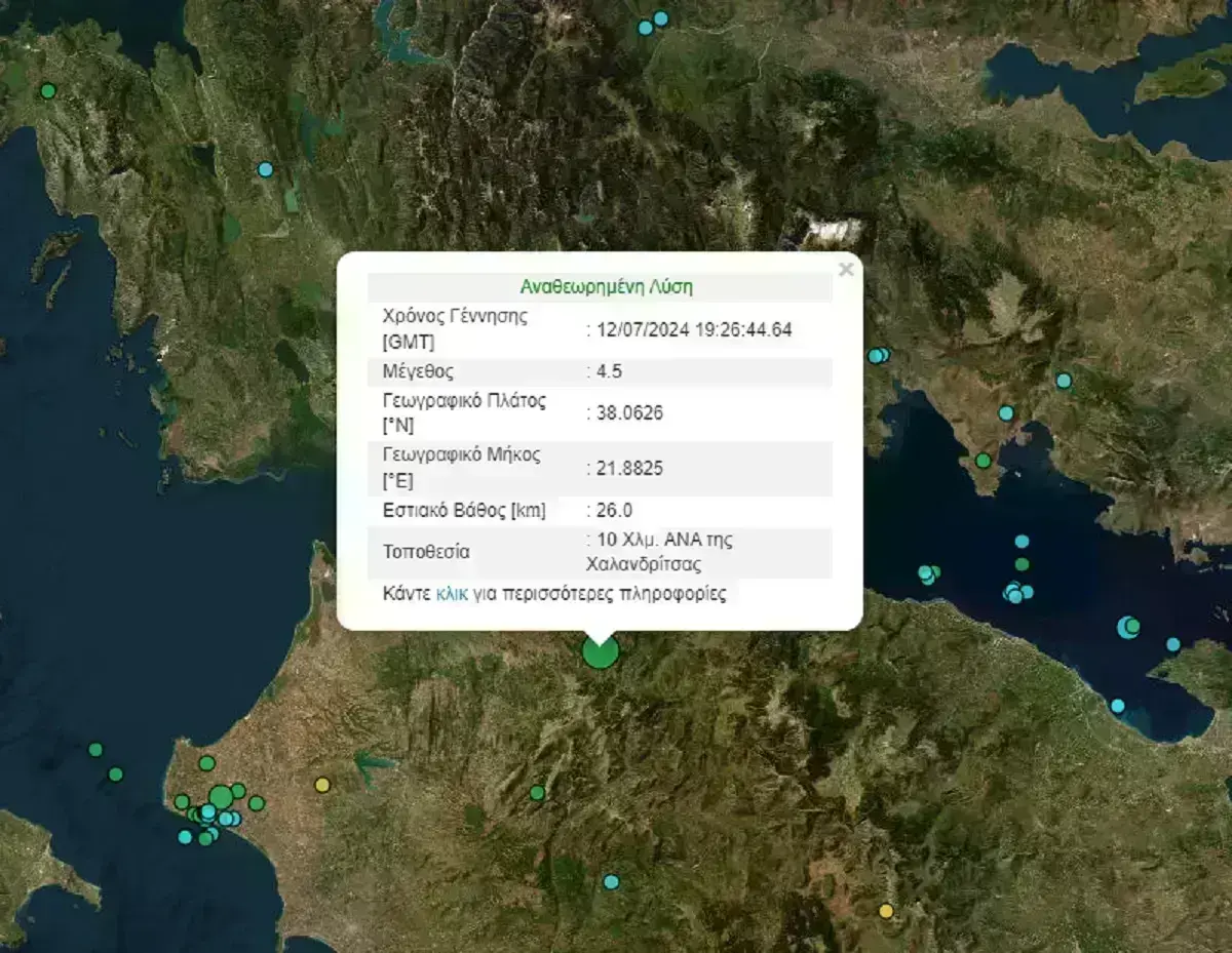 Σύμφωνα με την εκτίμηση του Γεωδυναμικού Ινστιτούτου, η δόνηση ήταν μεγέθους 4,5 βαθμών της κλίμακας Ρίχτερ. Το επίκεντρο υπολογίζεται στα 10 χιλιόμετρα ανατολικά/νοτιοανατολικά της Χαλανδρίτσας, ενώ το εστιακό του βάθος είναι στα 26 χιλιόμετρα (σύμφωνα με την αναθεωρημένη εκτίμηση). Ο σεισμός ήταν αισθητός σε Πάτρα, Αίγιο, Ναύπακτο, Μεσολόγγι και Αγρίνιο.