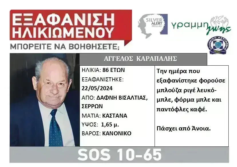 Πρόκειται για τον Άγγελο Καράπαλη. Έχει καστανά μάτια, ύψος 1,65μ και είναι κανονικού βάρους. Την ημέρα που εξαφανίστηκε φορούσε μπλούζα ριγέ λευκό-μπλε, φόρμα χρώματος μπλε και παντόφλες χρώματος καφέ. Πάσχει από άνοια. Η ζωή του βρίσκεται σε κίνδυνο.