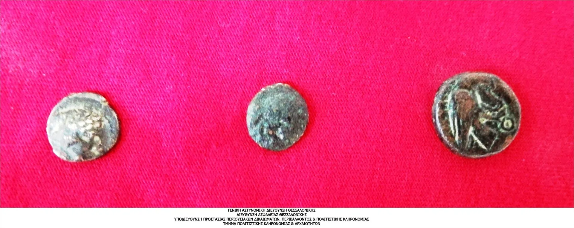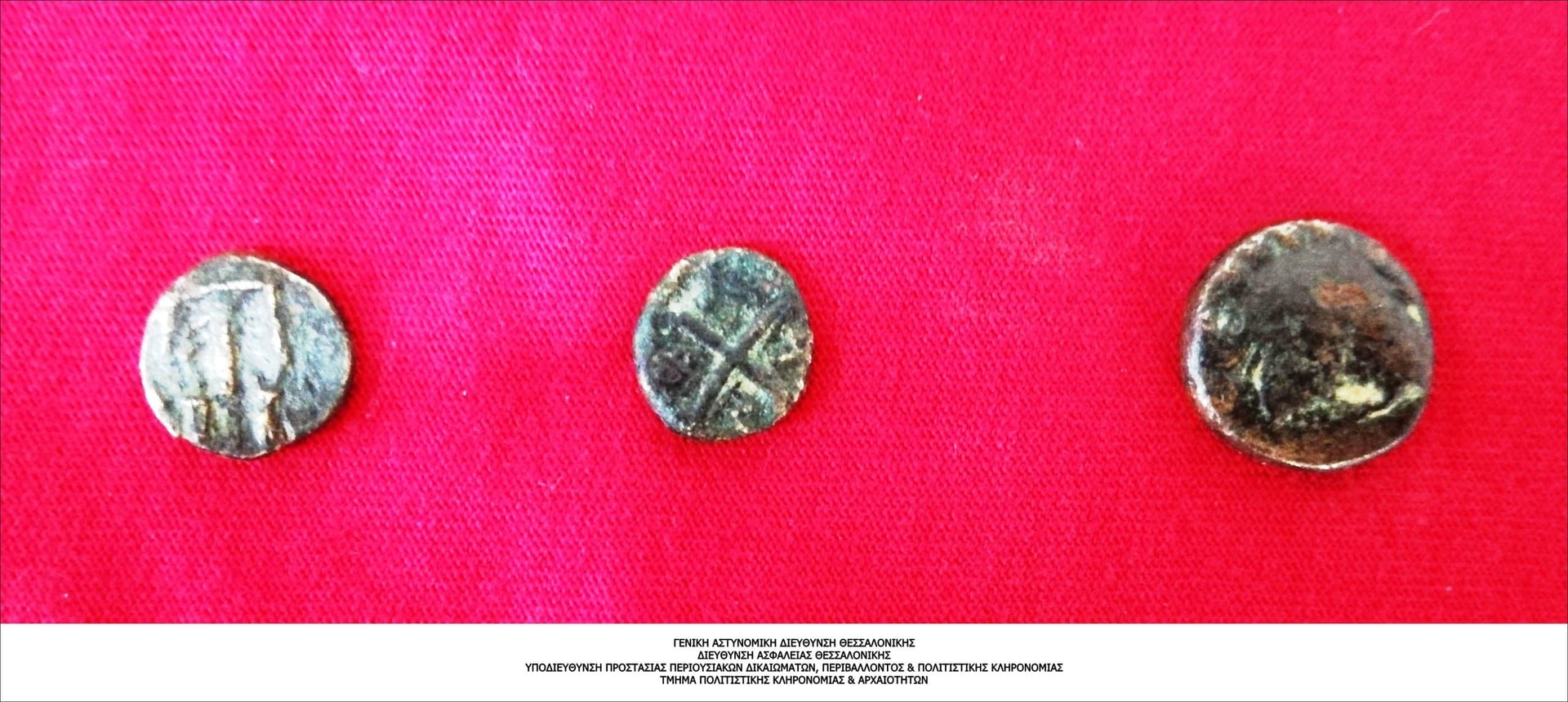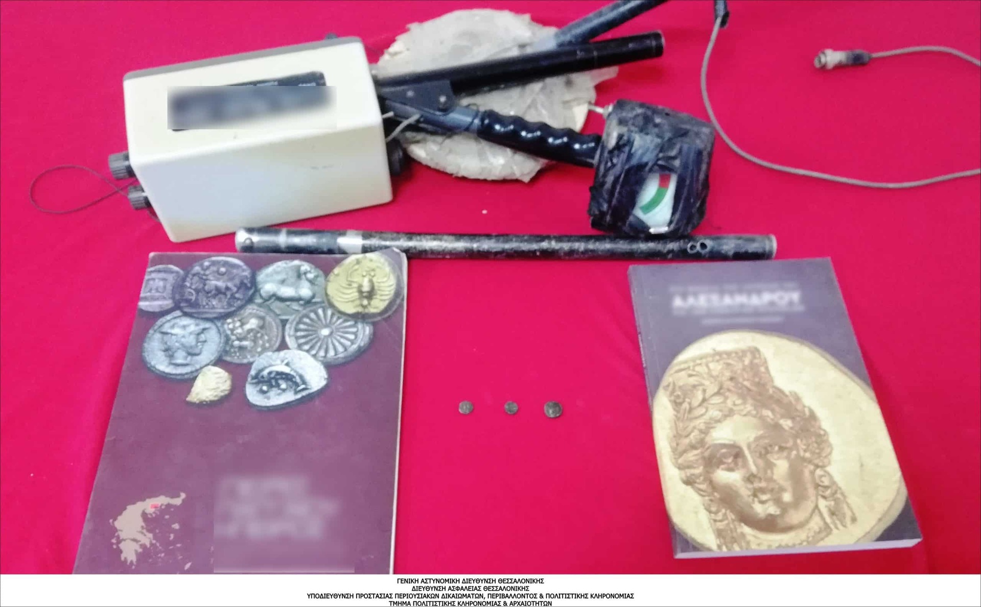 Ειδικότερα, χθες το πρωί πραγματοποιήθηκε οργανωμένη επιχείρηση σε περιοχή των Σερρών, κατά την οποία διενεργήθηκε νομότυπη έρευνα στην οικία του συλληφθέντα, όπου βρέθηκαν και κατασχέθηκαν: τρία χάλκινα νομίσματα του 4 ου π.Χ. αιώνα, ένας ανιχνευτής μετάλλων και δύο βιβλία που σχετίζονται με αρχαία νομίσματα.