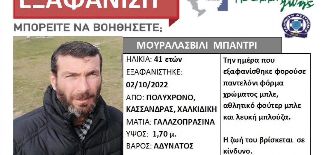 Ο δε αγνοούμενος έχει γαλαζοπράσινα μάτια, ύψος 1,75μ και είναι αδύνατος.