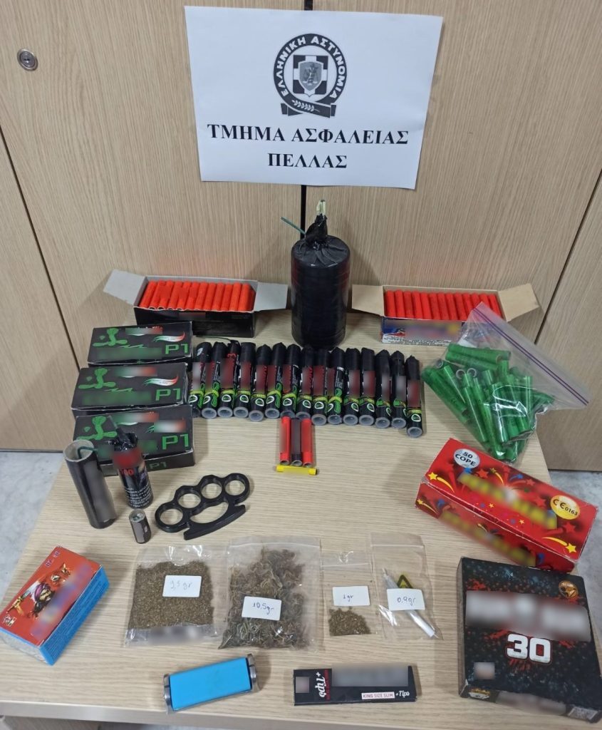 Σύμφωνα με την ΕΛ.ΑΣ., ο ανήλικος στο σπίτι του στην Πέλλα διαπιστώθηκε πως έκρυβε 177 κροτίδες, 21 γραμμάρια κάνναβης, 1 αυτοσχέδιο τσιγάρο κάνναβης και μία σιδερογροθιά, τα οποία κατασχέθηκαν.