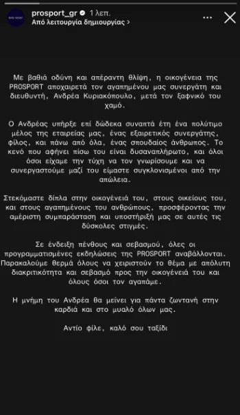 «Με βαθιά οδύνη και απέραντη θλίψη, η οικογένεια της PROSPORT αποχαιρετά τον αγαπημένου μας συνεργάτη και διευθυντή, Ανδρέα Κυριακόπουλο, μετά τον ξαφνικό του χαμό.