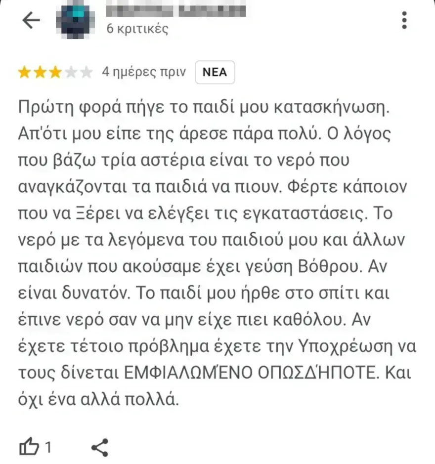 Ένας άλλος γονέας , σε σχόλιο – κριτική στο Google στη σελίδα της κατασκήνωσης πριν από έξι ημέρες, διαμαρτυρήθηκε για το νερό που καταναλώνουν τα παιδιά. Γράφει χαρακτηριστικά: «Πρώτη φορά πήγε το παιδί μου κατασκήνωση. Απ’ ότι μου είπε της άρεσε πάρα πολύ. Ο λόγος που βάζω τρία αστέρια είναι το νερό που αναγκάζονται τα παιδιά να πιουν. Φέρτε κάποιον που να ξέρει να ελέγξει τις εγκαταστάσεις. Το νερό σύμφωνα με τα λεγόμενα του παιδιού μου και άλλων παιδιών που ακούσαμε έχει γεύση βόθρου. Το παιδί μου ήρθε στο σπίτι και έπινε νερό σαν να μην είχε πιει καθόλου. Αν έχετε τέτοιο πρόβλημα, έχετε την υποχρέωση να τους δίνετε εμφιαλωμένο οπωσδήποτε»