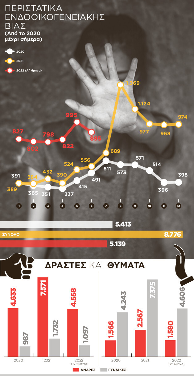 Το πρώτο 6μηνο του 2022, οι 4.558 δράστες ήταν άνδρες και οι 1.097 ήταν γυναίκες, ενώ τα θύματα 4.606 ήταν γυναίκες και 1.580 άνδρες. Το 2020 οι άνδρες δράστες ανέρχονταν στους 4.633 και 987 οι γυναίκες, ενώ 4.243 ήταν τα θύματα γυναίκες και 1.566 οι άνδρες. Το 2021 αυτοί οι αριθμοί εκτινάχθηκαν, κάτι που αναμένεται να γίνει και το 2022, καθώς οι άνδρες δράστες ήταν 7.571 και 1.732 οι γυναίκες, ενώ τα θύματα ήταν 7.375 γυναίκες και 2.567 άνδρες.