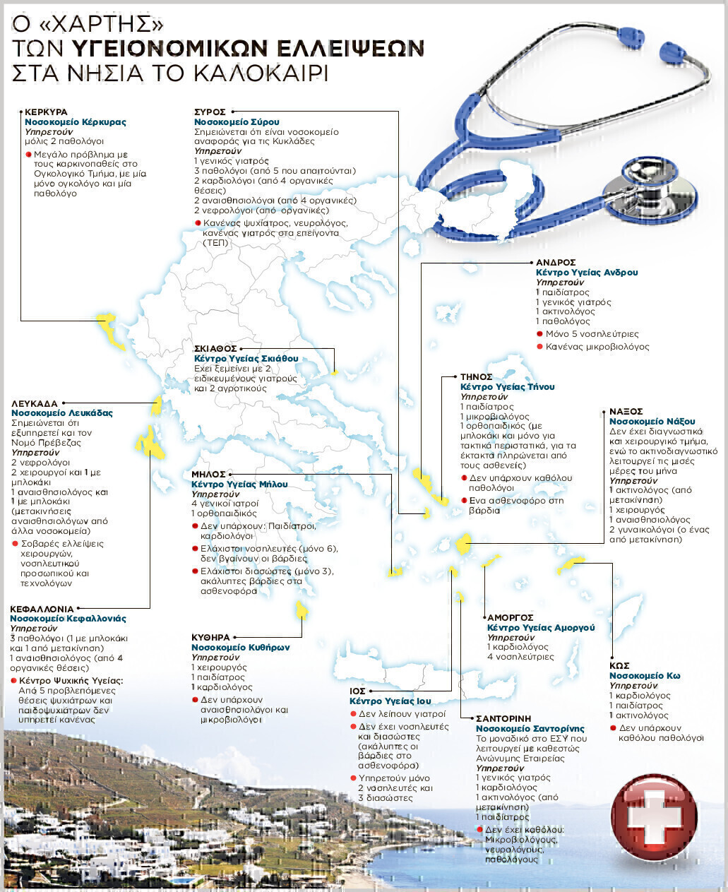 Ο «Ε.Τ.» της Κυριακής κατέγραψε τις ελλείψεις υγειονομικού προσωπικού σε όλα τα μεγάλα τουριστικά νησιά. Ελλείψεις που αγγίζουν απαγορευτικά επίπεδα για την ασφάλεια των πολιτών, σε συνδυασμό με τα εκατομμύρια των τουριστών που καταφθάνουν στη χώρα μας τους καλοκαιρινούς μήνες.