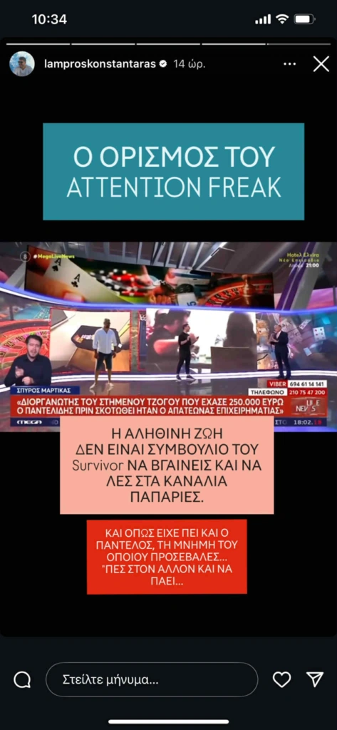 «Ο ορισμός του attention freak. Η ζωή δεν είναι συμβούλιο του Survivor να βγαίνεις και να λες στα κανάλια παπαριές. Και όπως είχε πει και ο Παντέλος, τη μνήμη του οποίου προσέβαλες… “Πες στον άλλον και να πάει…”».