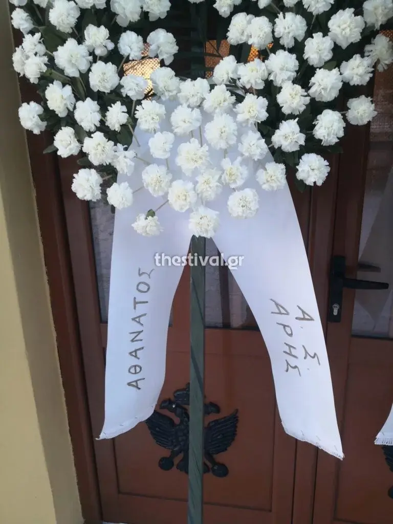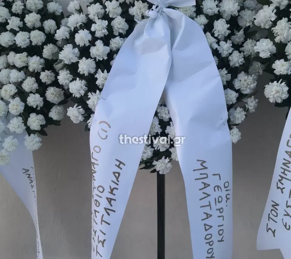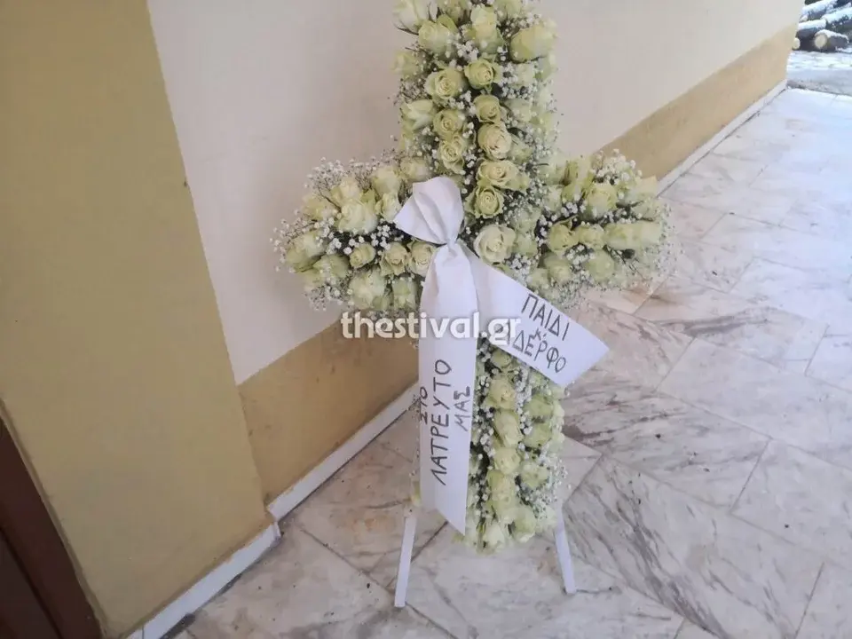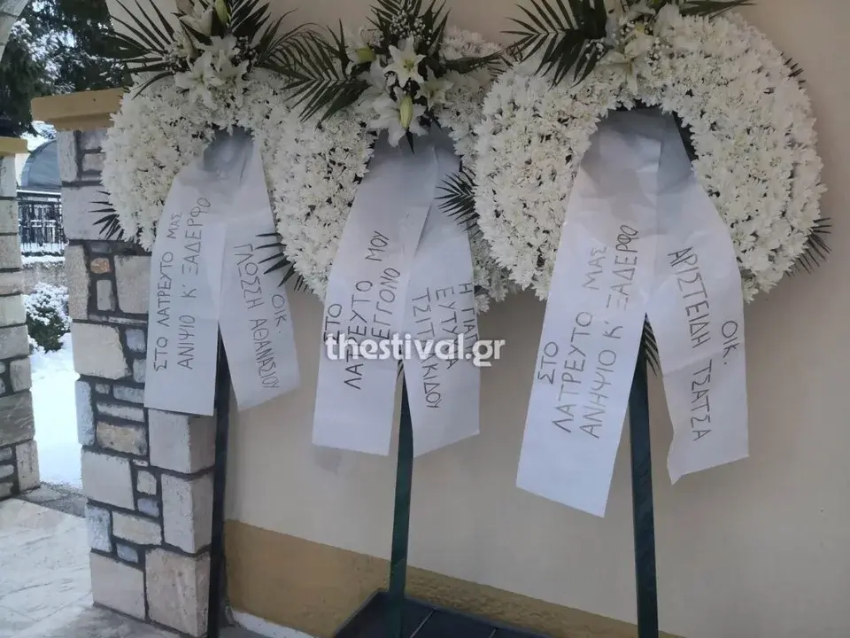Εργαζόμενοι του Δήμου βρίσκονταν από νωρίς στην εκκλησία για να καθαρίσουν το χιόνι. Λίγο πριν τις 8 το πρωί ξεκίνησαν να μεταφέρονται στον Ιερό Ναό τα πρώτα στεφάνια και, κατά πληροφορίες, ο αριθμός τους ξεπερνάει τα 100. Στεφάνια έχουν φτάνει στην εκκλησία από από τους γονείς του, τον αδερφό και τη γιαγιά του, τον Α.Σ. Άρης που ήταν και η αγαπημένη του ομάδα, από πολιτικούς, συγγενείς και φίλους, αλλά και από την οικογένεια του σμηναγού Γιώργου Μπαλταδόρου, πιλότου του μοιραίου Mirage 2000-5, που βρήκε τραγικό θάνατο μετά την συνετρίβη του αεροσκάφους το 2018, ύστερα από προσπάθεια προσγείωσης.
