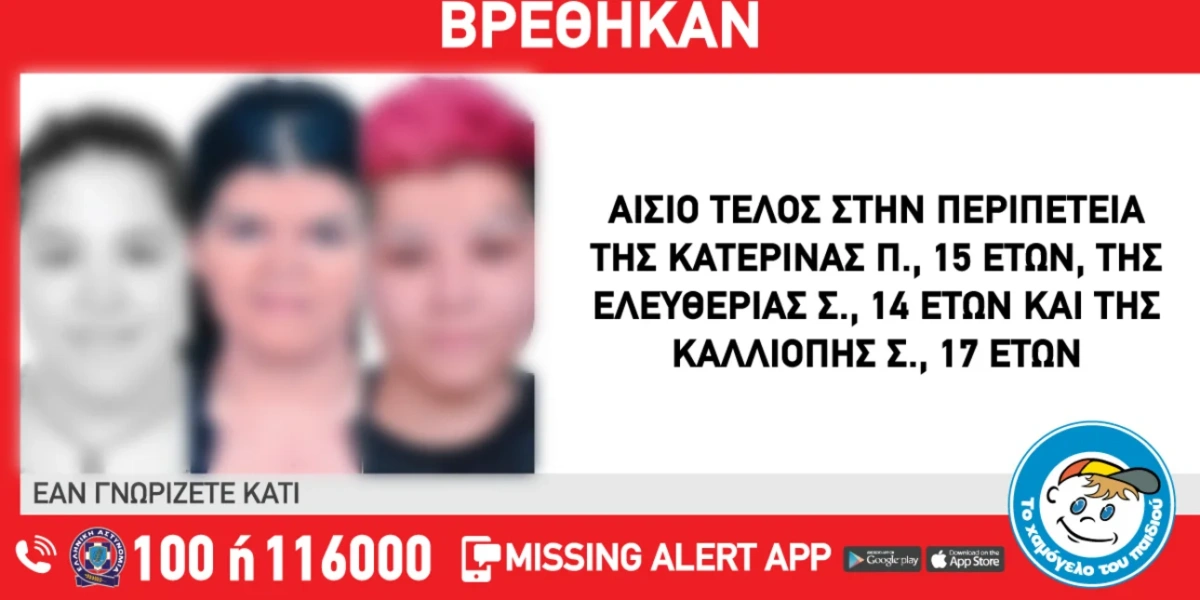 Όπως ενημέρωσε το «Χαμόγελο του Παιδιού», η Κατερίνα Π., 15 ετών, η Ελευθερία Σ., 14 ετών και η Καλλιόπη Σ., 17 ετών εντοπίστηκαν στη Σίνδο Θεσσαλονίκης και είναι καλά στην υγεία τους.