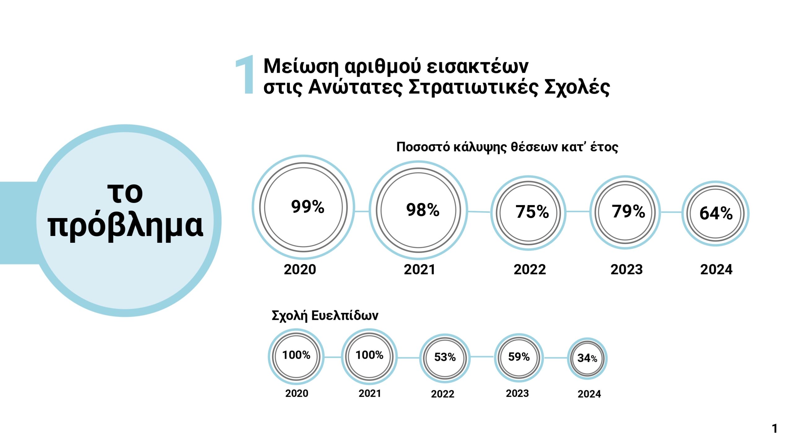 Ο κ. Δένδιας, παρουσιάζοντας το πρόβλημα, ανέφερε, μεταξύ άλλων, ότι το 2020 το ποσοστό κάλυψης των θέσεων στις Ανώτατες Στρατιωτικές Σχολές της χώρας προσέγγιζε το 99% και το 2024 μειώθηκε σε 64%, ενώ ειδικότερα στη Σχολή Ευελπίδων το ποσοστό κάλυψης ήταν 100% το 2020 και έχει περιοριστεί σε μόλις 34%.