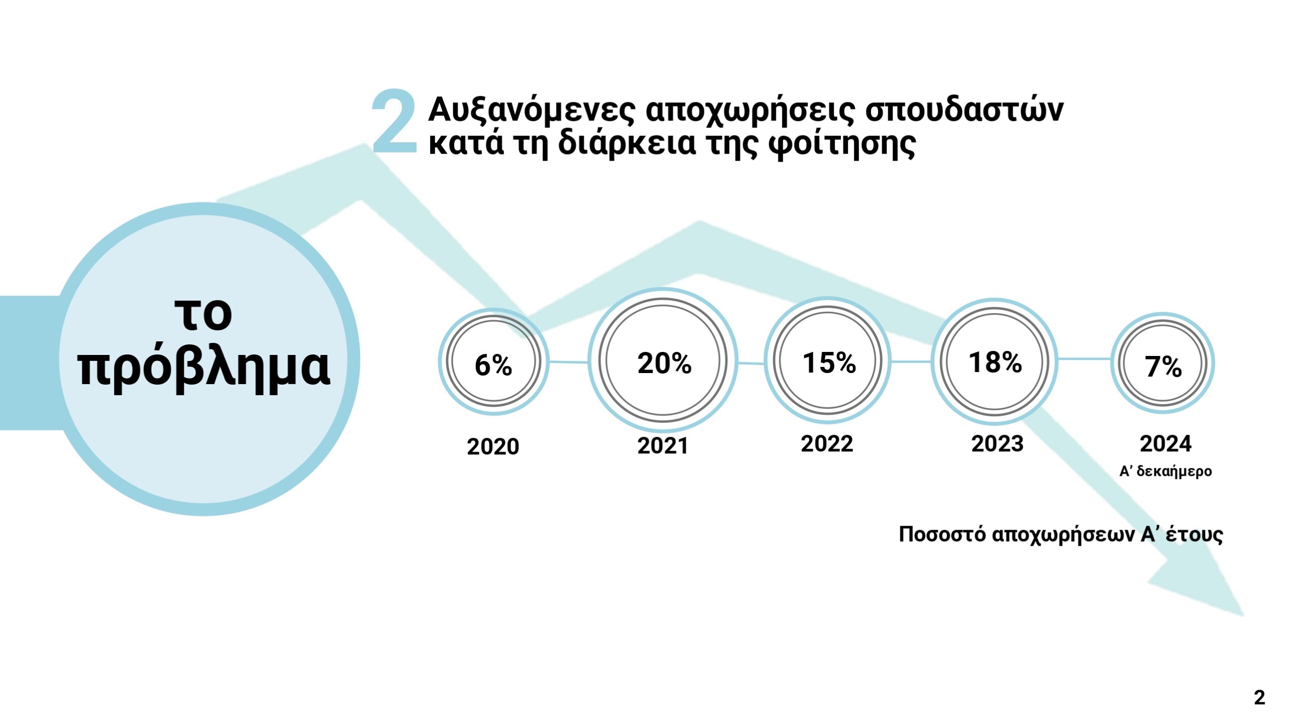 Τόνισε ότι, παράλληλα, παρουσιάζεται αυξανόμενη αποχώρηση σπουδαστών κατά το πρώτο έτος φοίτησης, αναφέροντας ότι το 2020% το ποσοστό ήταν 6%, το 2021 ανήλθε σε 20%, το 2022 σε 15%, το 2023 σε 18%, ενώ το 2024 σε 7%.