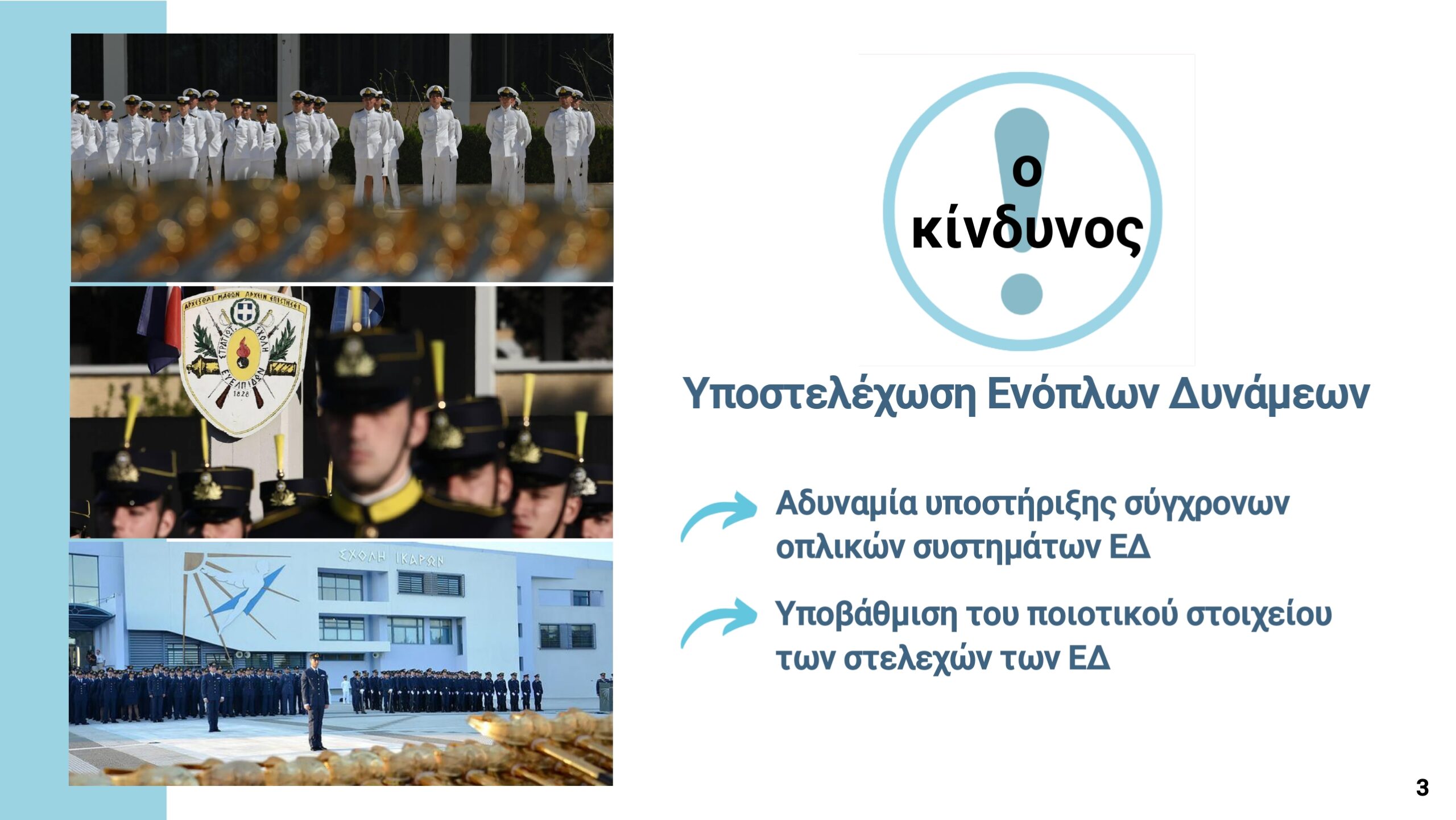 Ο κίνδυνος, κατά τον υπουργό Εθνικής Άμυνας, είναι η υποστελέχωση των Ενόπλων Δυνάμεων με συνεπακόλουθο την αδυναμία υποστήριξης των σύγχρονων οπλικών συστημάτων και την υποβάθμιση του ποιοτικού στοιχείου των Ενόπλων Δυνάμεων.