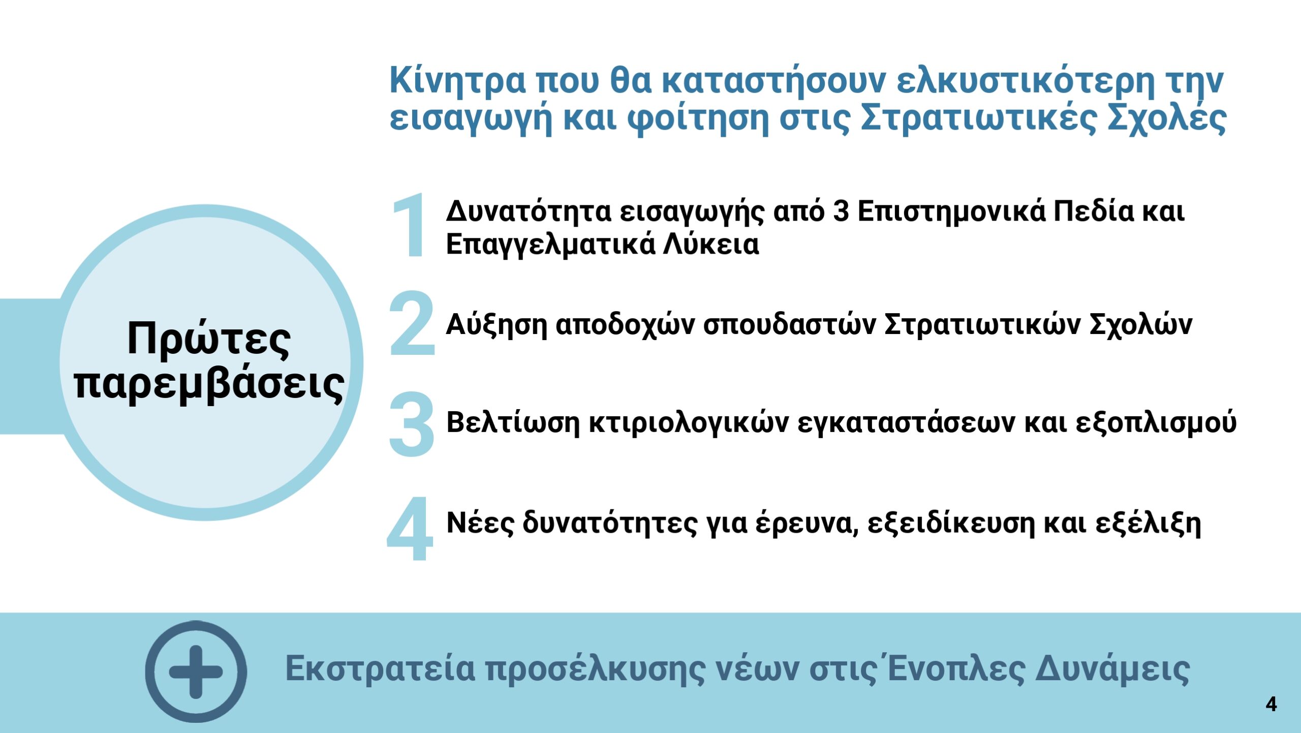 Όπως ανέφερε ο κ. Πιερρακάκης, οι πρώτες παρεμβάσεις, στο πλαίσιο της εκστρατείας προσέλκυσης νέων στις Ένοπλες Δυνάμεις, αφορούν σε κίνητρα που θα καταστήσουν ελκυστικότερη την εισαγωγή και φοίτηση στις Στρατιωτικές Σχολές, όπως: