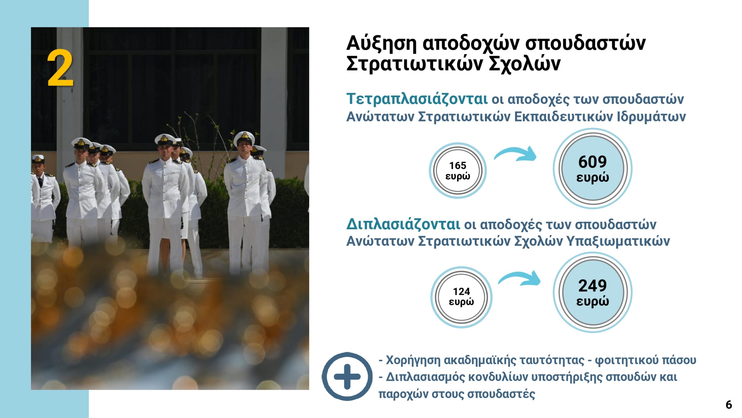 Εξειδικεύοντας, ο Νίκος Δένδιας επισήμανε ότι αναφορικά με την αύξηση των αποδοχών των σπουδαστών στρατιωτικών σχολών, τετραπλασιάζονται οι αποδοχές των σπουδαστών Ανώτατων Στρατιωτικών Εκπαιδευτικών Ιδρυμάτων από 165 ευρώ σε 609 ευρώ, ενώ διπλασιάζονται οι αποδοχές των Ανώτατων Στρατιωτικών Σχολών Υπαξιωματικών από 124 σε 249 ευρώ.