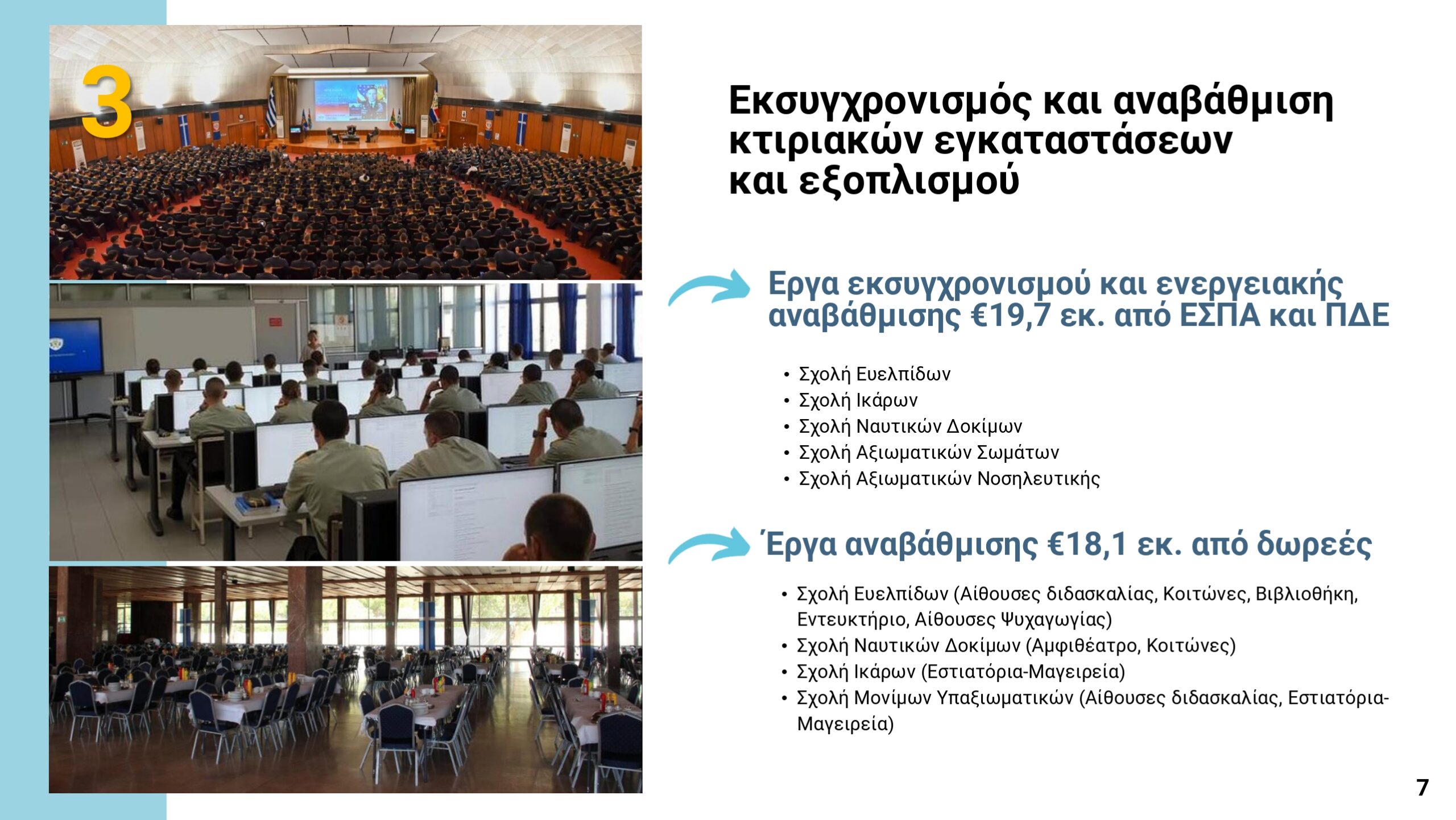 Όσον αφορά τον εκσυγχρονισμό και την αναβάθμιση κτιριακών εγκαταστάσεων και εξοπλισμού θα προχωρήσουν έργα ύψους 19,7 εκατ. ευρώ από το ΕΣΠΑ και το Πρόγραμμα Δημοσίων Επενδύσεων σε Σχολή Ευελπίδων, Σχολή Ικάρων, Σχολή Ναυτικών Δοκίμων, Σχολή Αξιωματικών Σωμάτων και Σχολή Αξιωματικών Νοσηλευτικής, ενώ θα γίνουν και έργα αναβάθμισης 18,1 εκατ. ευρώ από δωρεές για τις αίθουσες διδασκαλίας, τους κοιτώνες, τη βιβλιοθήκη, το εντευκτήριο και τις αίθουσες ψυχαγωγίας στη Σχολή Ευελπίδων, το αμφιθέατρο και τους κοιτώνες της Σχολής Ναυτικών Δοκίμων, τα εστιατόρια και μαγειρεία της Σχολής Ικάρων καθώς και τις αίθουσες διδασκαλίας, τα εστιατόρια και μαγειρεία της Σχολής Μονίμων Υπαξιωματικών.