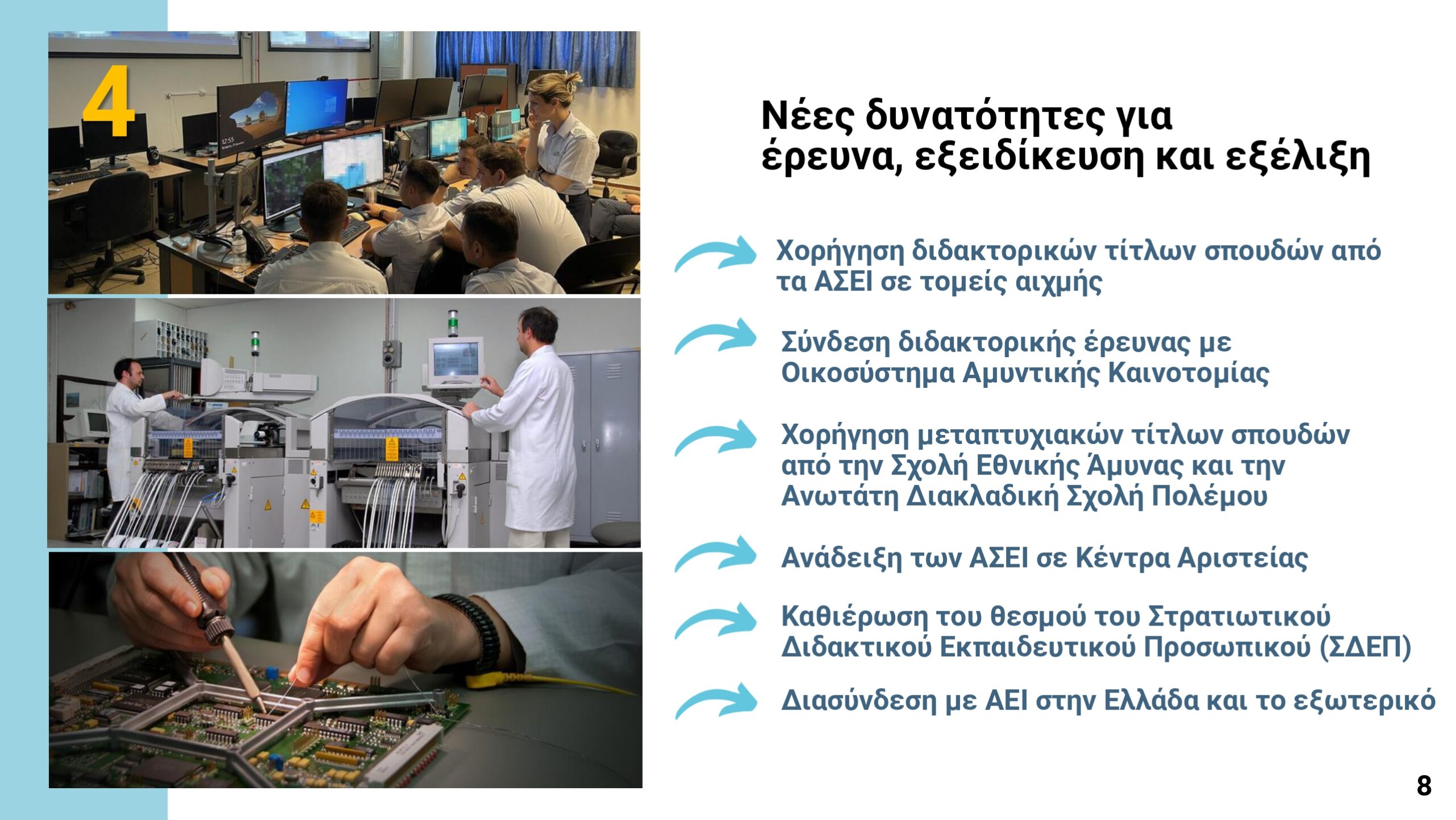 Αναφορικά με τις νέες δυνατότητες για έρευνα, εξειδίκευση και εξέλιξη θα χορηγούνται διδακτορικοί τίτλοι σπουδών από τα Ανώτατα Στρατιωτικά Εκπαιδευτικά Ιδρύματα σε τομείς αιχμής, θα προχωρήσει η σύνδεση διδακτορικής έρευνας με το Οικοσύστημα Αμυντικής Καινοτομίας, θα χορηγούνται μεταπτυχιακοί τίτλοι σπουδών από τη Σχολή Εθνικής Άμυνας και την Ανώτατα Διακλαδική Σχολή Πολέμου, θα αναδειχθούν τα Ανώτατα Στρατιωτικά Εκπαιδευτικά Ιδρύματα σε Κέντρα Αριστείας, καθιερώνεται ο θεσμός του Στρατιωτικού Διδακτικού Εκπαιδευτικού Προσωπικού και θα γίνει διασύνδεση με ΑΕΙ στην Ελλάδα και το εξωτερικό.