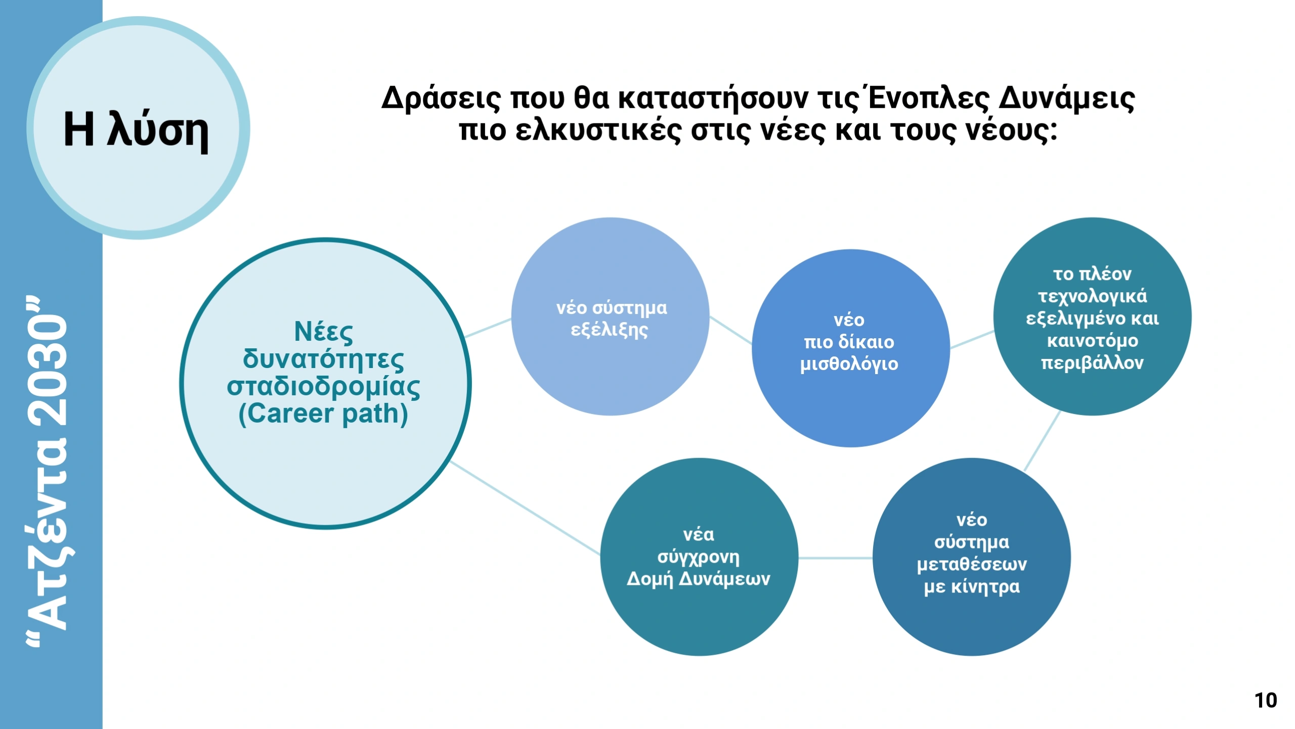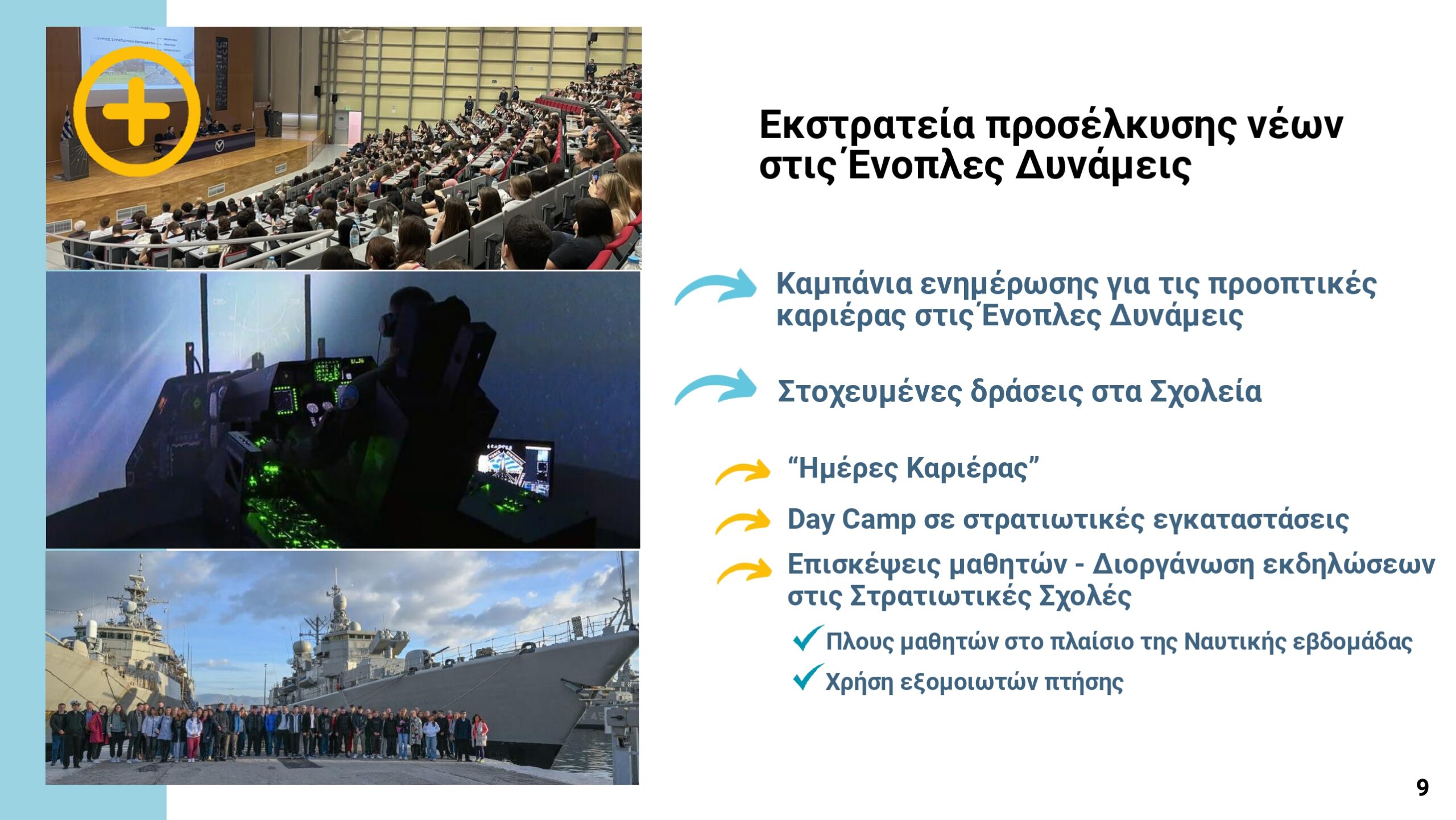 Η εκστρατεία προσέλκυσης νέων στις Ένοπλες Δυνάμεις περιλαμβάνει καμπάνια ενημέρωσης για τις προοπτικές καριέρας στις Ένοπλες Δυνάμεις, στοχευμένες δράσεις στα σχολεία, ενώ ήδη διεξάγονται δράσεις, όπως ο πλους μαθητών στο πλαίσιο της Ναυτικής εβδομάδας αλλά και η χρήση εξομοιωτών πτήσης της Πολεμικής Αεροπορίας.