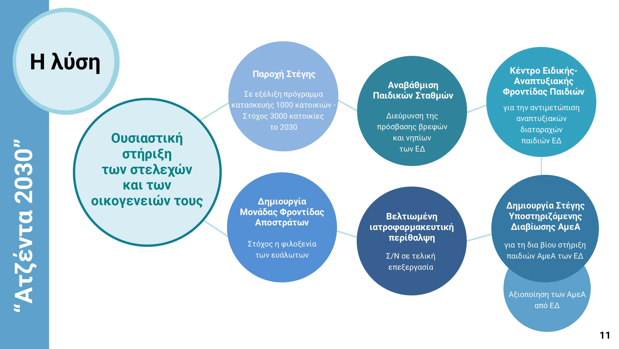 Αναφορικά με την ουσιαστική στήριξη των στελεχών και των οικογενειών τους, ο κ. Δένδιας εξήγησε ότι σχετικά με την παροχή στέγης ήδη είναι σε εξέλιξη πρόγραμμα κατασκευής 1.000 κατοικιών με στόχο τις 3.000 κατοικίες το 2030. Επίσης, θα προχωρήσει η αναβάθμιση των παιδικών σταθμών, το Κέντρο Ειδικής Αναπτυξιακής Φροντίδας Παιδιών για την αντιμετώπιση αναπτυξιακών διαταραχών παιδιών στελεχών των Ενόπλων Δυνάμεων, η δημιουργία Στέγης Υποστηριζόμενης Διαβίωσης ΑμεΑ, η αξιοποίηση των ΑμεΑ από τις Ένοπλες Δυνάμεις, θα βελτιωθεί η ιατροφαρμακευτική περίθαλψη με το νομοσχέδιο να βρίσκεται σε τελική επεξεργασία, ενώ θα δημιουργηθεί και Μονάδα Φροντίδας Αποστράτων με στόχο τη φιλοξενία των ευάλωτων.