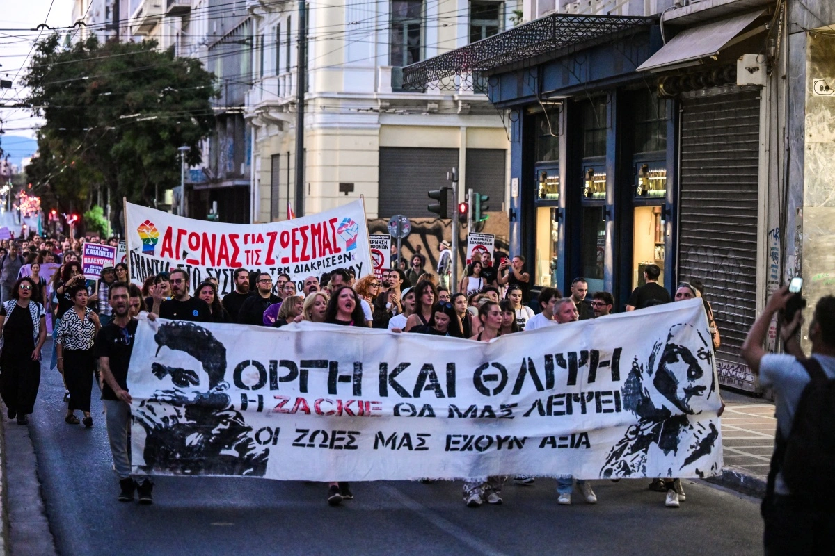 Πλήθος κόσμου αρχικά συγκεντρώθηκε στο κέντρο της Αθήνας είτε για τα εφτά χρόνια από τη δολοφονία του Ζακ Κωστόπουλου είτε για τον απεργό πείνας Πάνο Ρούτσι, τον πατέρα του 22χρονου Ντένι, που σκοτώθηκε στο σιδηροδρομικό δυστύχημα των Τεμπών.