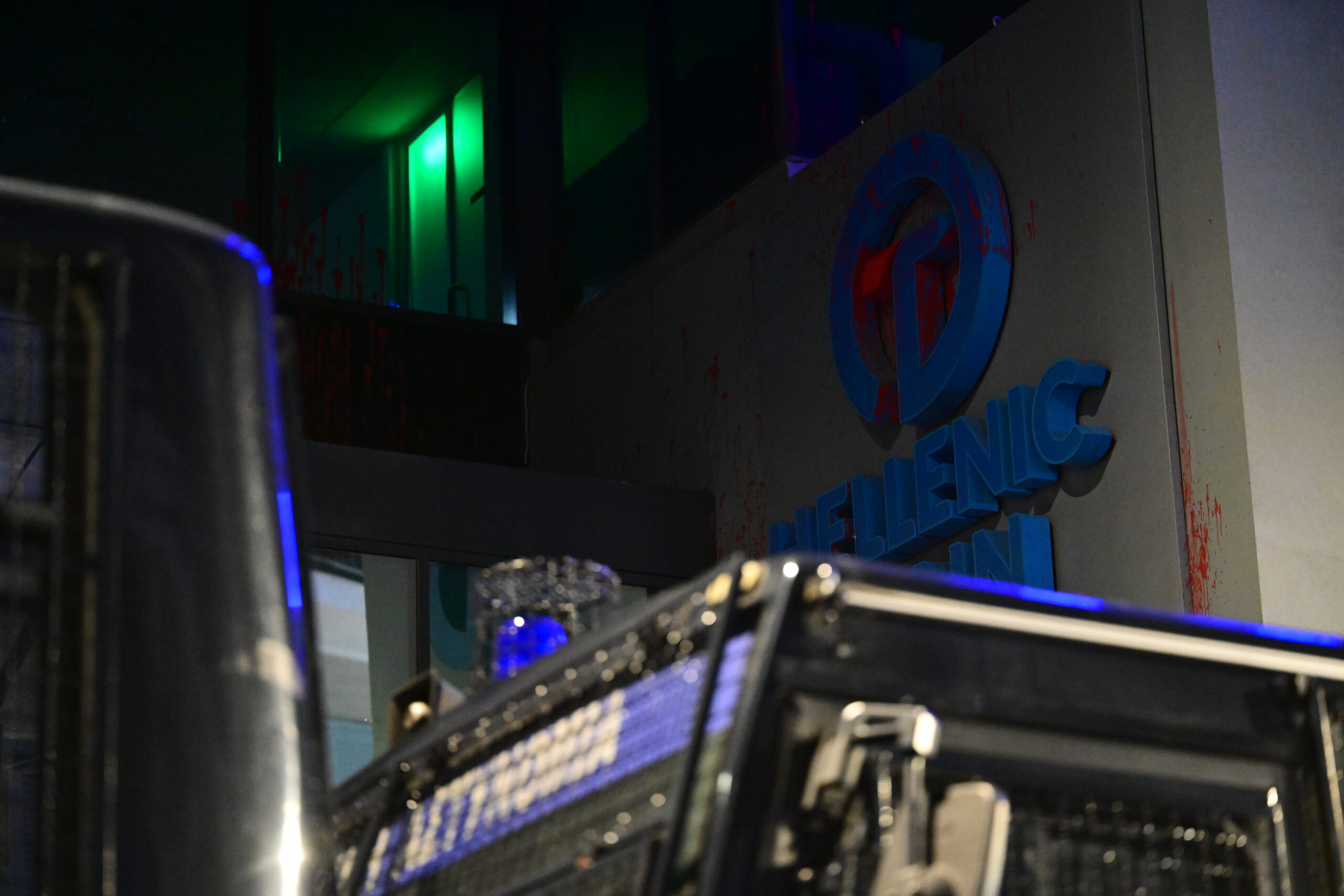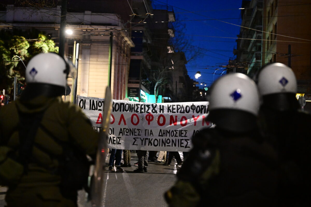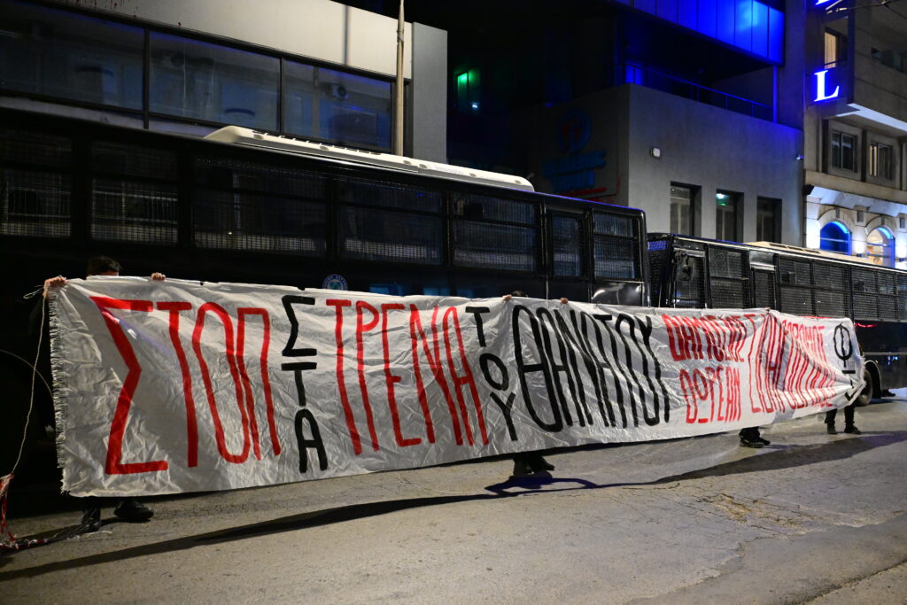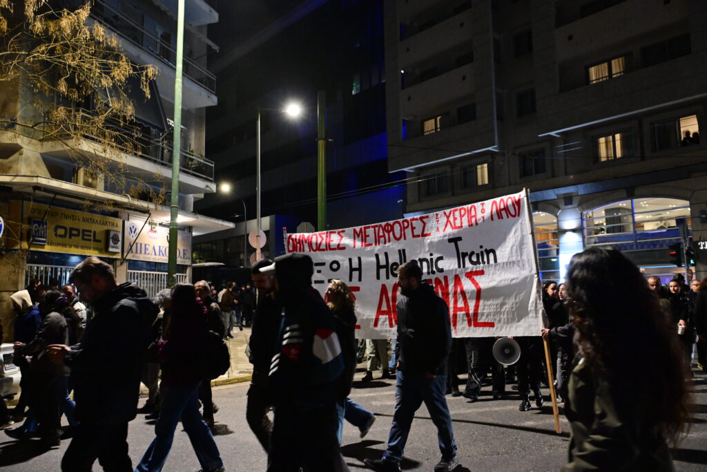 Οι συγκεντρωμένοι στάθηκαν με τα πανό τους μπροστά από τα κεντρικά της Hellenic Train και φώναξαν συνθήματα.