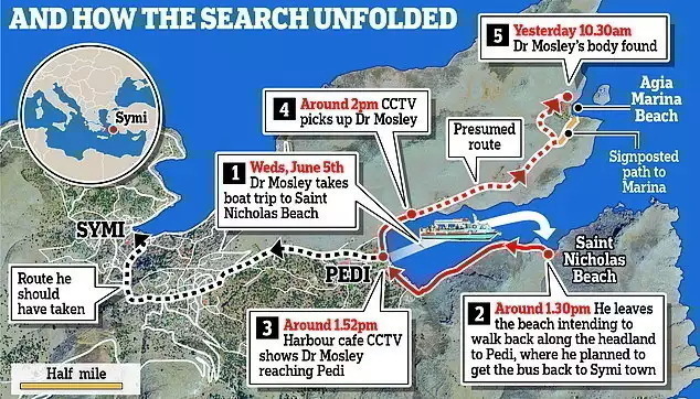 Τα ίχνη του 68χρονου είχαν χαθεί από την περασμένη Τετάρτη, με τις επίγειες και εναέριες έρευνες να έχουν επεκταθεί σε όλο το νησί, αφού δεν απέφερε αποτέλεσμα η σάρωση της ευρύτερης περιοχής της παραλίας Άγιος Νικόλαος. Ο Μάικλ Μόσλεϊ παραθέριζε στο νησί της Σύμης, είχε πάει για μπάνιο και επέστρεφε με τα πόδια από δυσπρόσιτη παραλία.