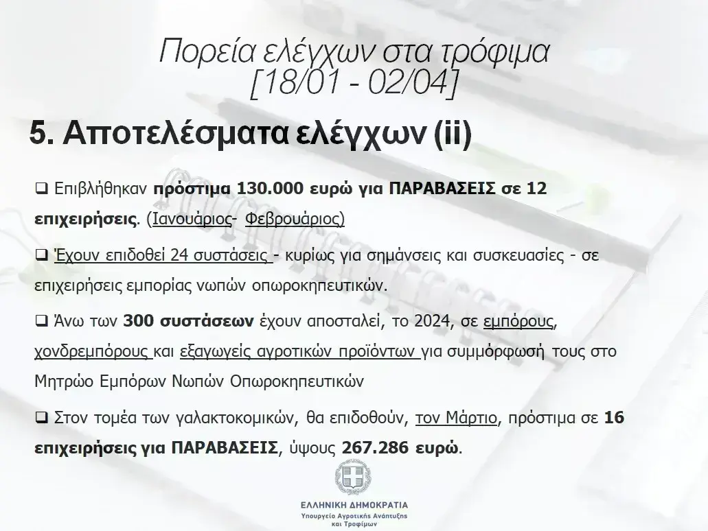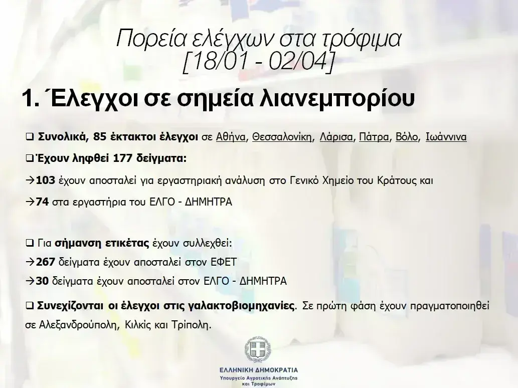 Παράλληλα συνεχίζονται οι έλεγχοι στα γαλακτοκομικά και οπωροκηπευτικά, ενώ έχουν ξεκινήσει έλεγχοι στο ελαιόλαδο και στο μέλι.