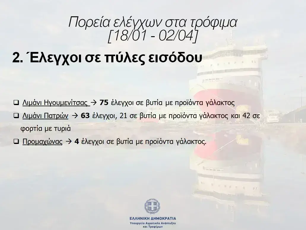 – Στο λιμάνι των Πατρών έχουν γίνει 63 έλεγχοι (21 σε βυτία προϊόντων γάλακτος και 42 σε φορτία με τυριά).