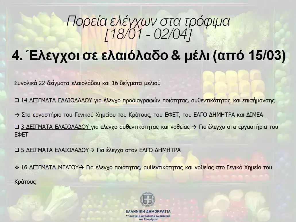 Από τις 15.03.2024 τα μικτά κλιμάκια διενεργούν ελέγχους στο ελαιόλαδο και στο μέλι. Συνολικά έχουν ληφθεί 22 δείγματα ελαιολάδου και 16 δείγματα μελιού.
