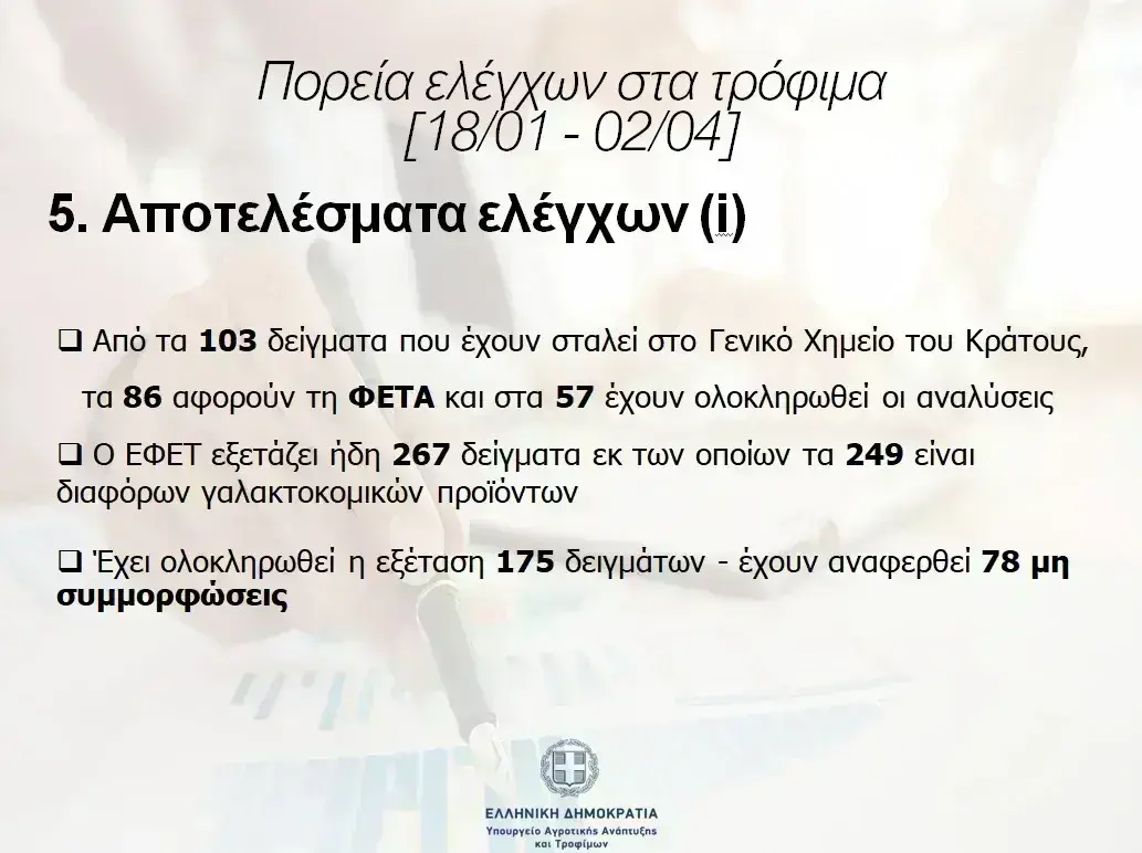 Σημειώνεται ότι δίνεται ιδιαίτερη έμφαση στον έλεγχο προϊόντων ΠΟΠ, όπως η ΦΕΤΑ, που είναι ταυτισμένα με την ελληνική παραγωγή.
