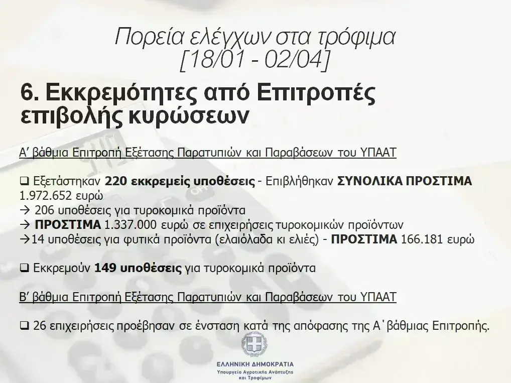 Από το 2020 έως σήμερα, έχουν εξετασθεί συνολικά 220 υποθέσεις που εκκρεμούσαν και έχουν υποβληθεί πρόστιμα ύψους 1.503.281 ευρώ. Εξ αυτών η συντριπτική πλειονότητα των υποθέσεων, αφορούσε σε τυροκομικά προϊόντα (206 υποθέσεις). Και τα πρόστιμα που έχουν επιβληθεί σε επιχειρήσεις τυροκομικών προϊόντων είναι 1.337.100 ευρώ.