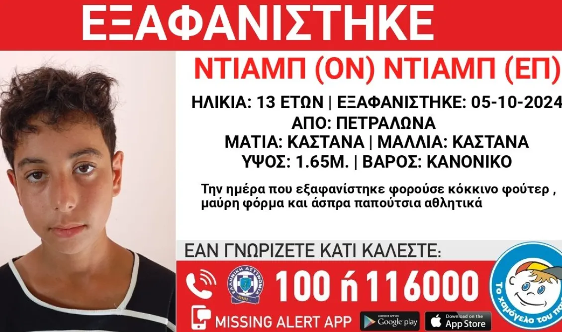 Συγκεκριμένα, πρόκειται για ανήλικο με ύψος 1,65 μ., κανονικό βάρος, καστανά μαλλιά και καστανά μάτια. Την ημέρα που εξαφανίστηκε φορούσε κόκκινο φούτερ, μαύρη φόρμα και άσπρα αθλητικά παπούτσια.